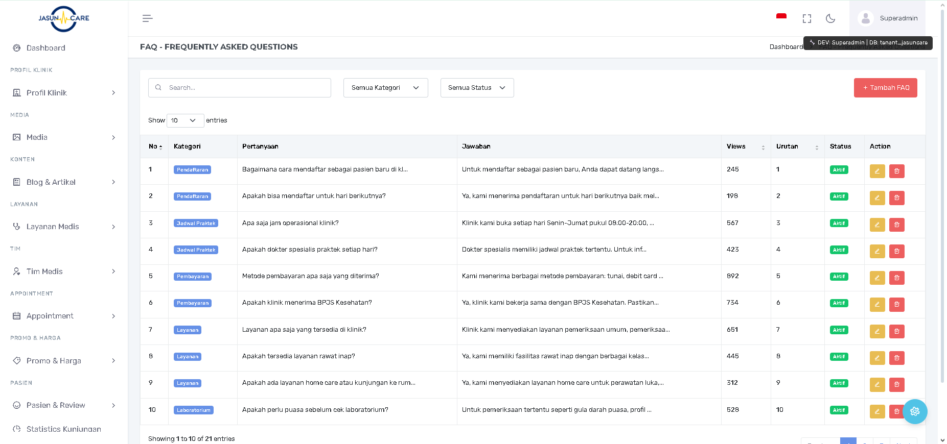 Fitur ini digunakan untuk membuat, mengelola, dan mengkategorikan daftar pertanyaan dan jawaban yang sering diajukan oleh pasien. Daftar ini biasanya ditampilkan di website (frontend) klinik.