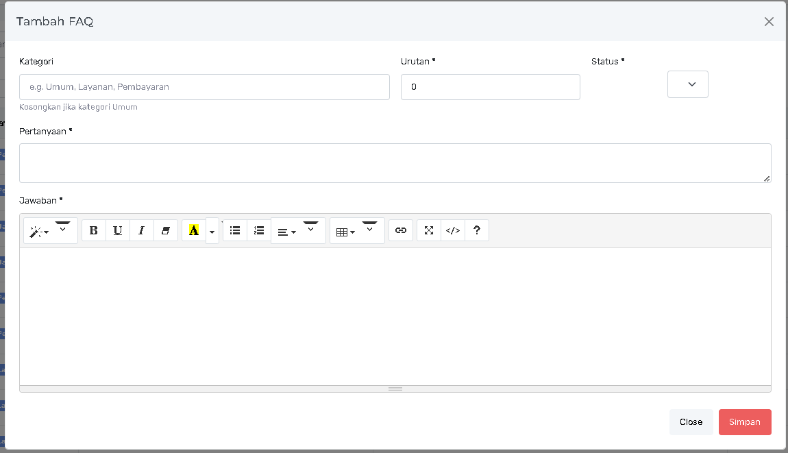 2. Formulir Tambah/Ubah FAQ (Create & Update via Modal)