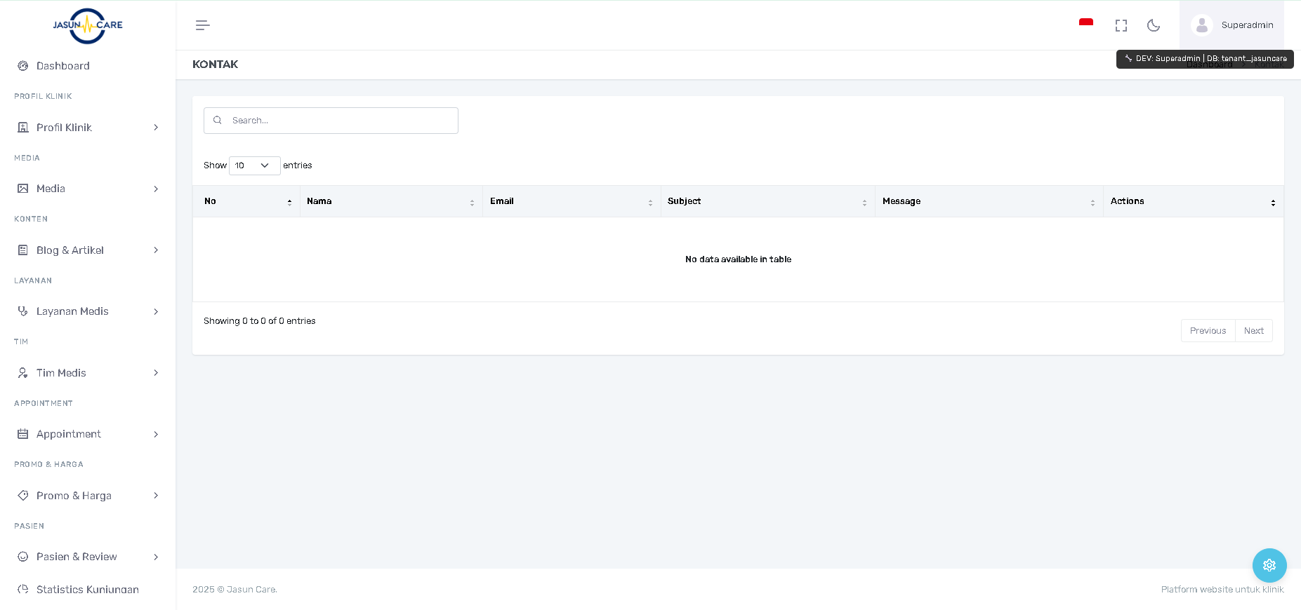 Halaman ini berfungsi sebagai inbox atau daftar rekap semua pesan yang dikirimkan oleh pengunjung atau pasien melalui formulir kontak yang tersedia di website (frontend).