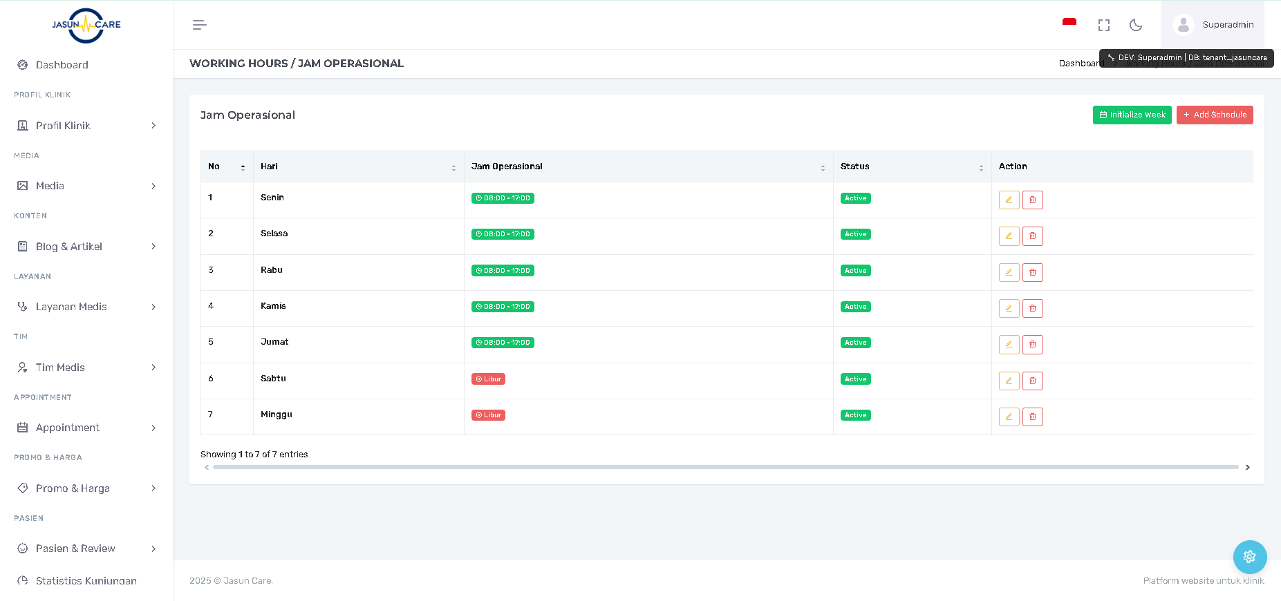 Akses halaman ini melalui menu PROFIL KLINIK > Working Hours / Jam Operasional (asumsi menu) untuk melihat jadwal mingguan.