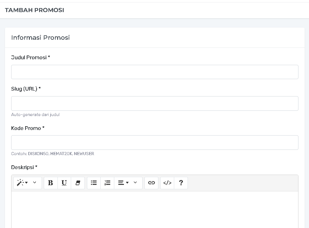 | Deskripsi | Ya | Penjelasan rinci tentang promosi. Gunakan editor teks (bold, list, dll.) untuk format yang rapi. |