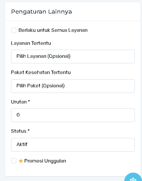 | Paket Kesehatan Tertentu | Opsional | Gunakan dropdown Pilih Paket untuk membatasi promosi hanya pada paket kesehatan yang dipilih. |
