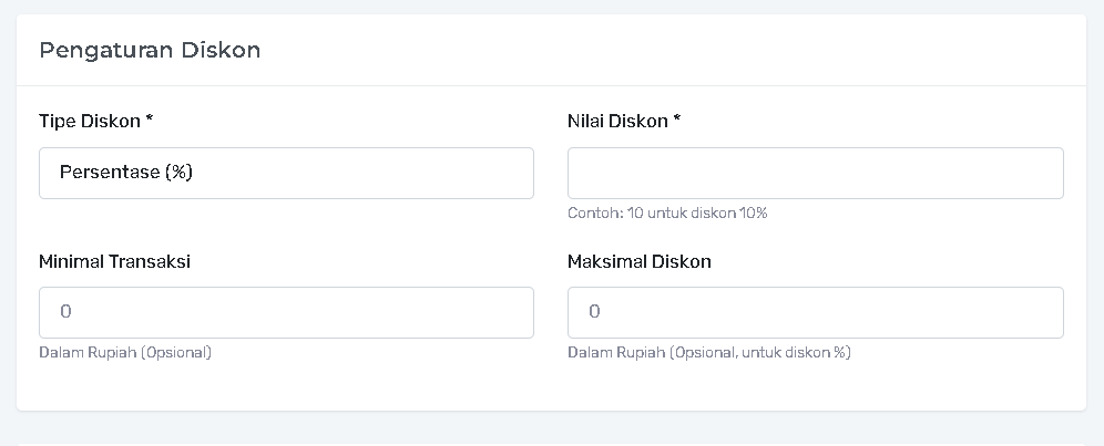 | Tipe Diskon | Ya | Pilih tipe diskon: Persentase (%) atau Rupiah (Rp). |