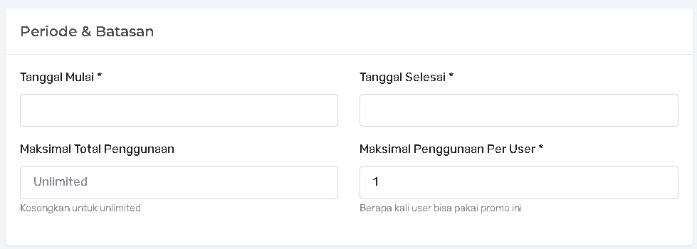 | Maksimal Total Penggunaan | Opsional | Jumlah total penggunaan yang diizinkan untuk promosi ini. Kosongkan untuk Unlimited. |