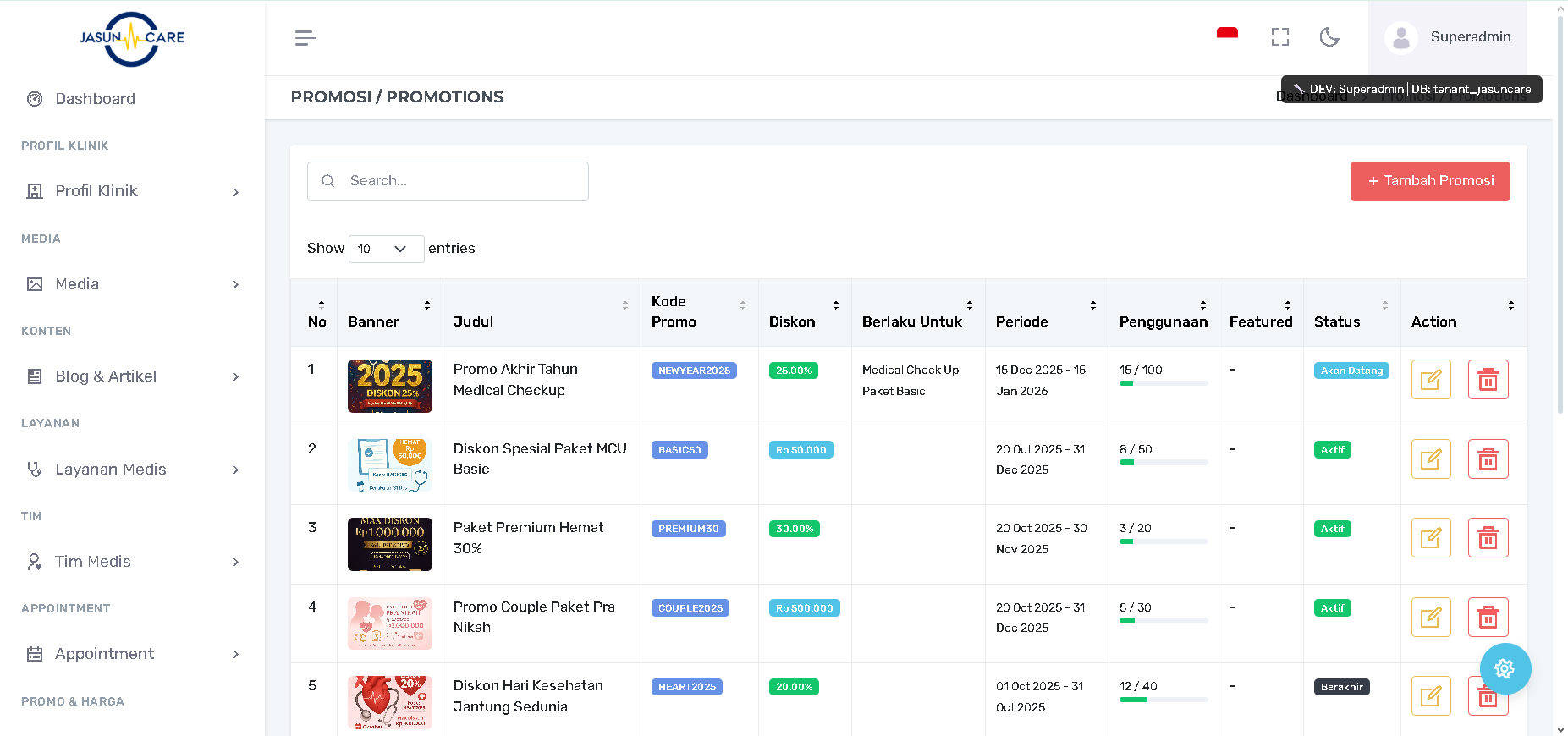 Fitur ini memungkinkan Anda untuk membuat, mengelola, dan mengaktifkan berbagai promosi, diskon, atau paket khusus yang akan ditampilkan kepada pasien.