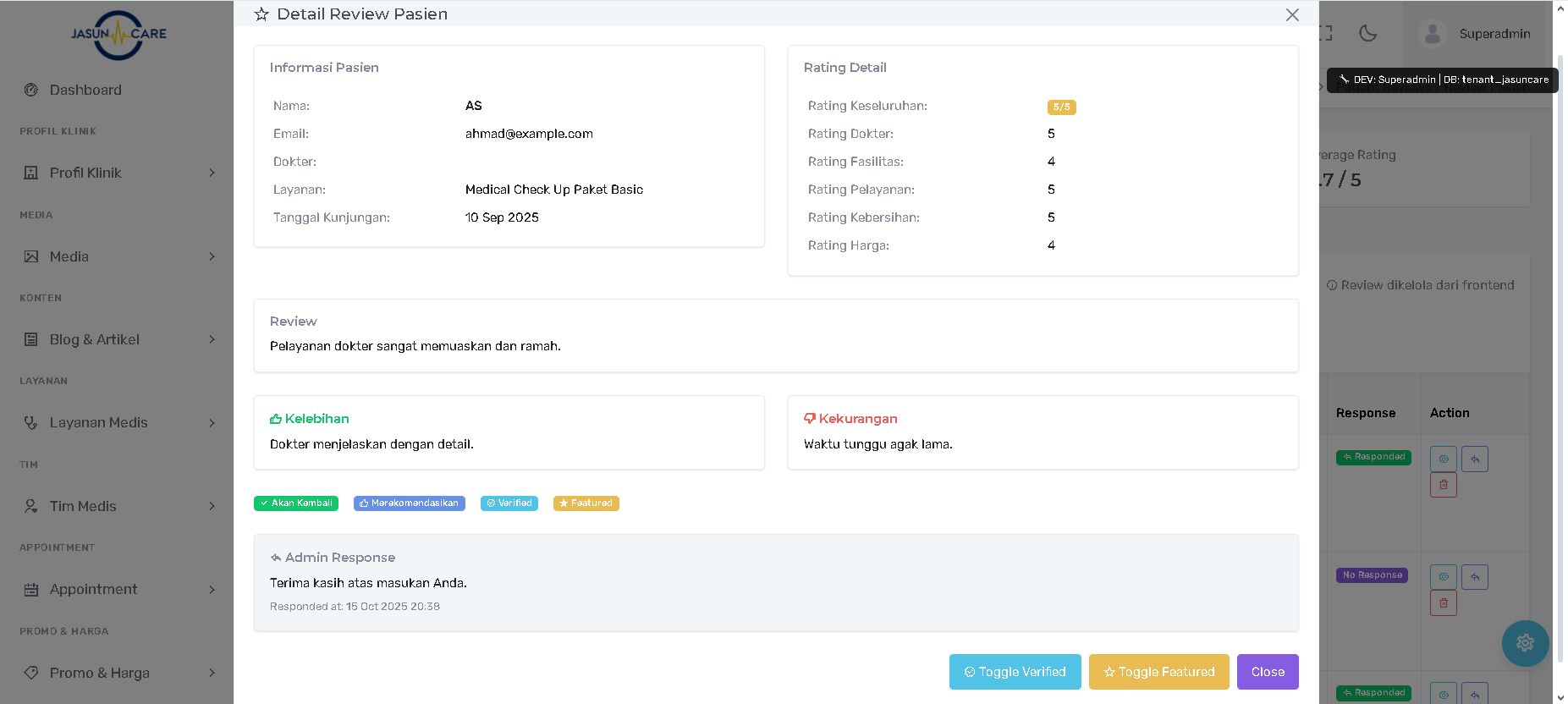 | Feedback | Kualitas Ulasan | Indikator cepat untuk Kelebihan (Akan Kembali / Hijau) dan Kekurangan (Harap diperhatikan / Biru) yang diberikan pasien. |