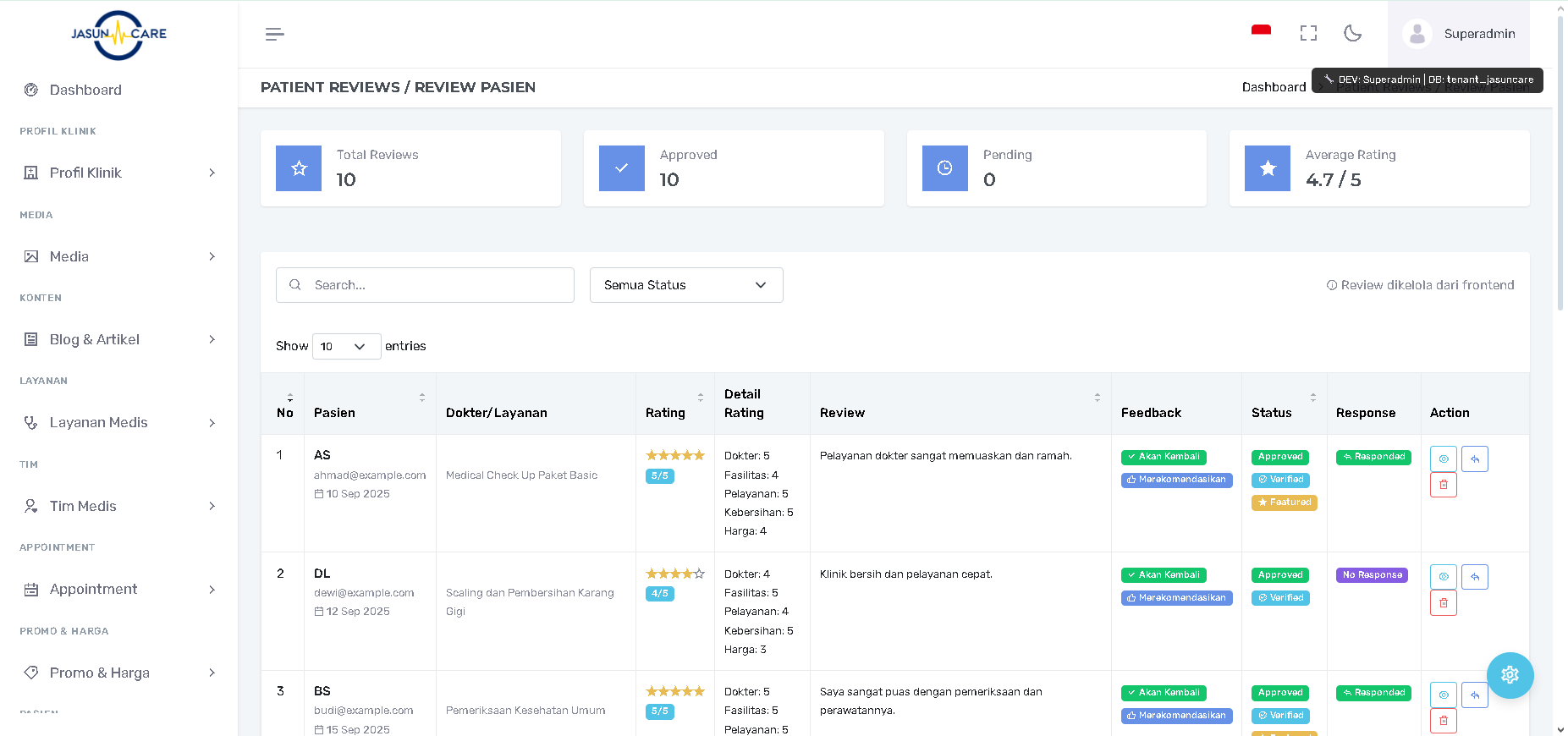 Halaman ini adalah pusat moderasi dan analitik untuk semua ulasan dan penilaian (Rating) yang diberikan pasien setelah mendapatkan layanan. Tujuannya adalah memantau kualitas layanan dan berinteraksi langsung dengan umpan balik pasien.