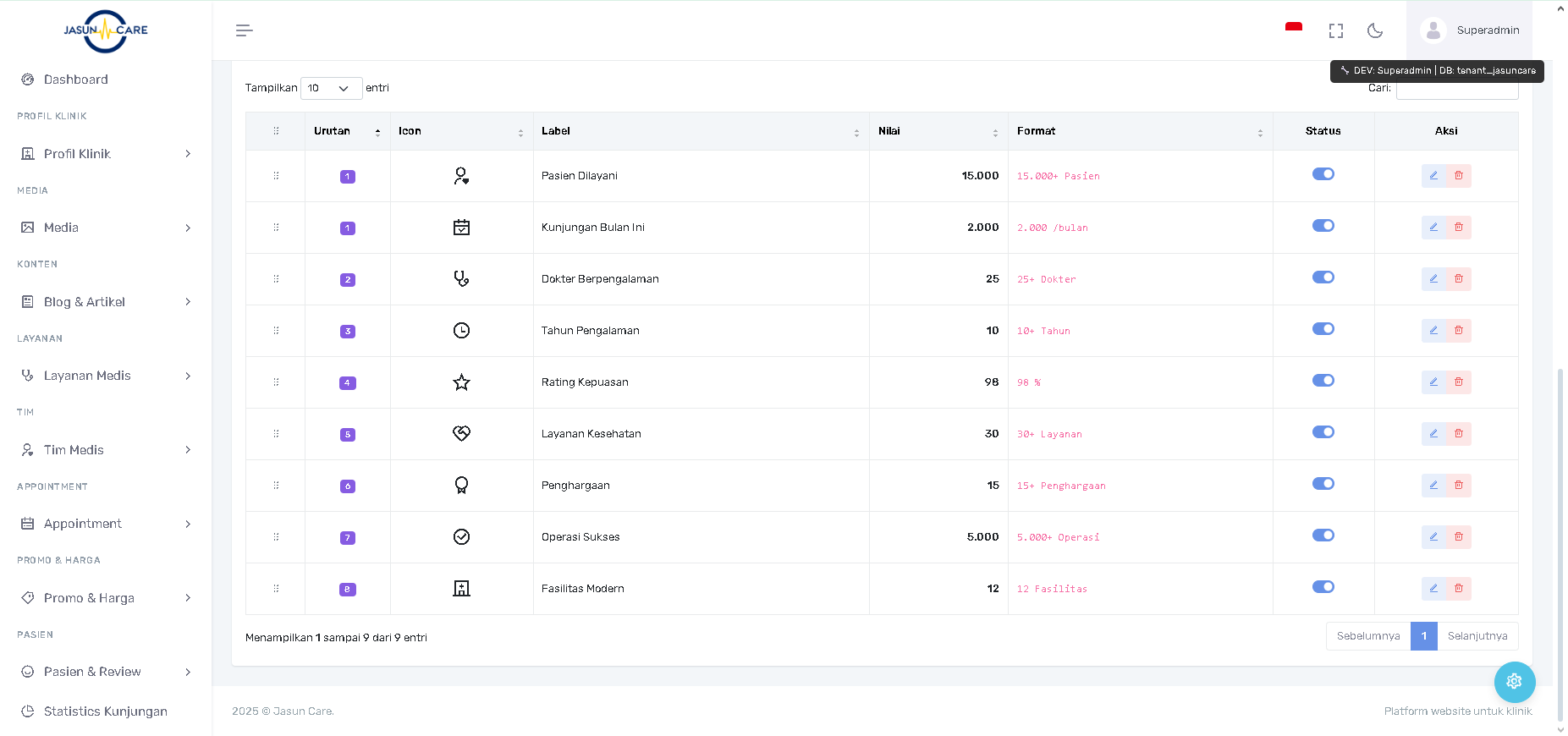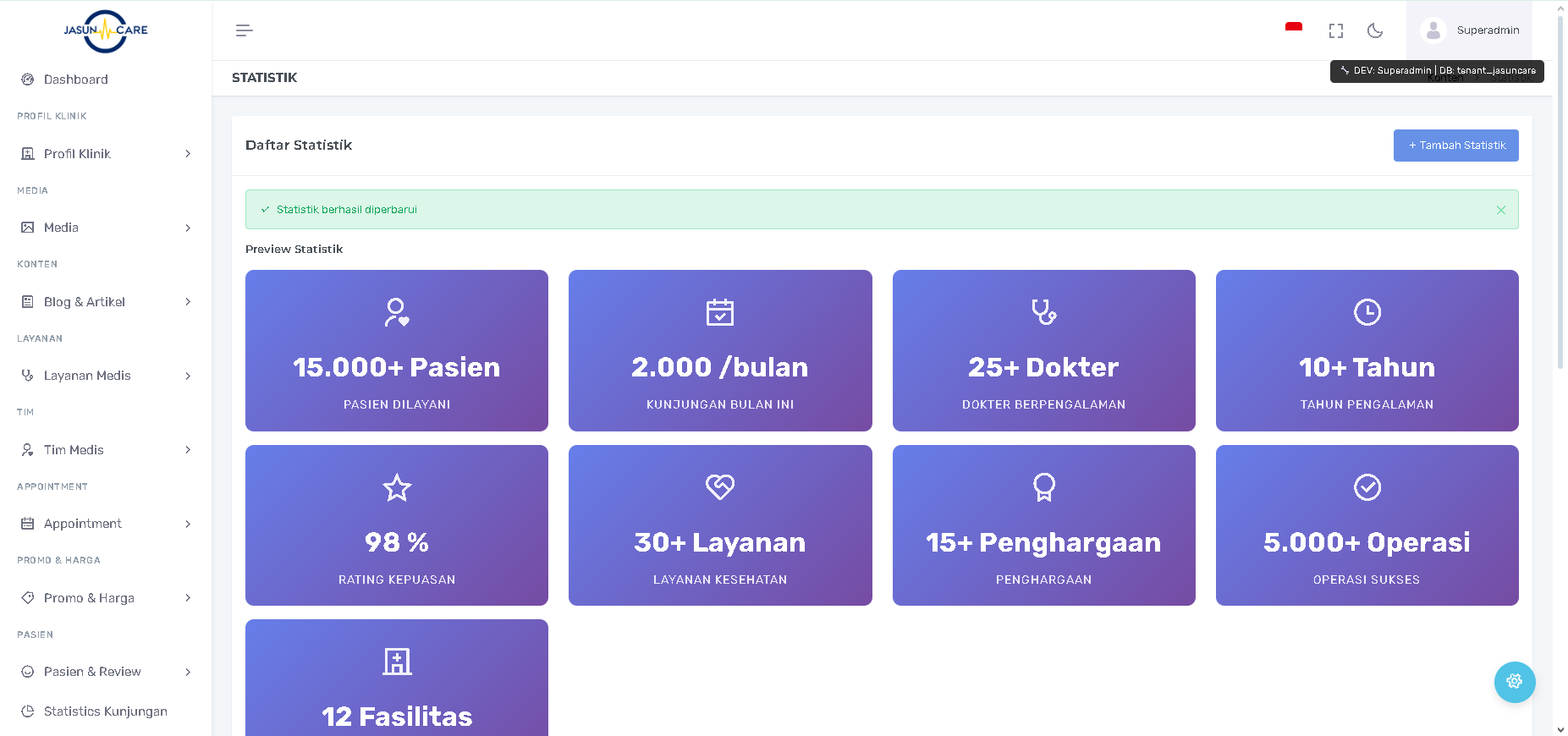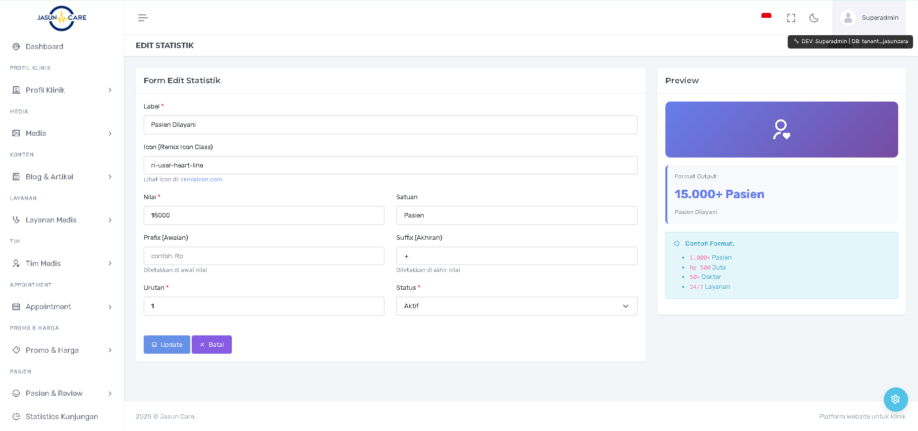 Manfaat: Admin dapat langsung melihat bagaimana tampilan akhir statistik di frontend sebelum menyimpannya, memastikan format (e.g., 45 Pasien) sudah benar.