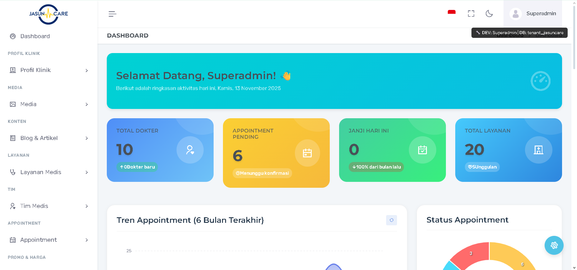 - Status Appointment (Chart Donut): Menampilkan perbandingan status Janji Temu (Confirmed, Completed, Pending, Cancelled). Ini menunjukkan efektivitas Anda dalam memproses booking.