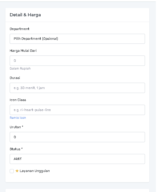 Department (Opsional): Pilih Department yang menaungi layanan ini (contoh: Poli Anak).