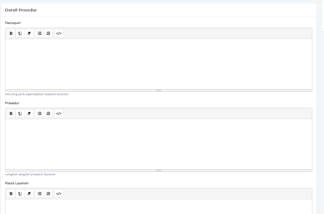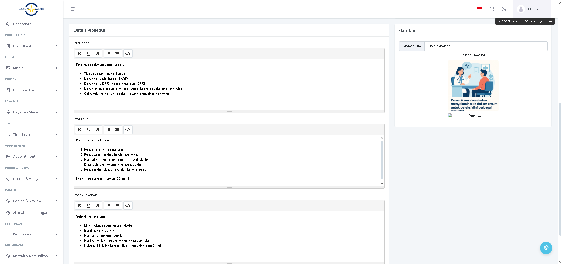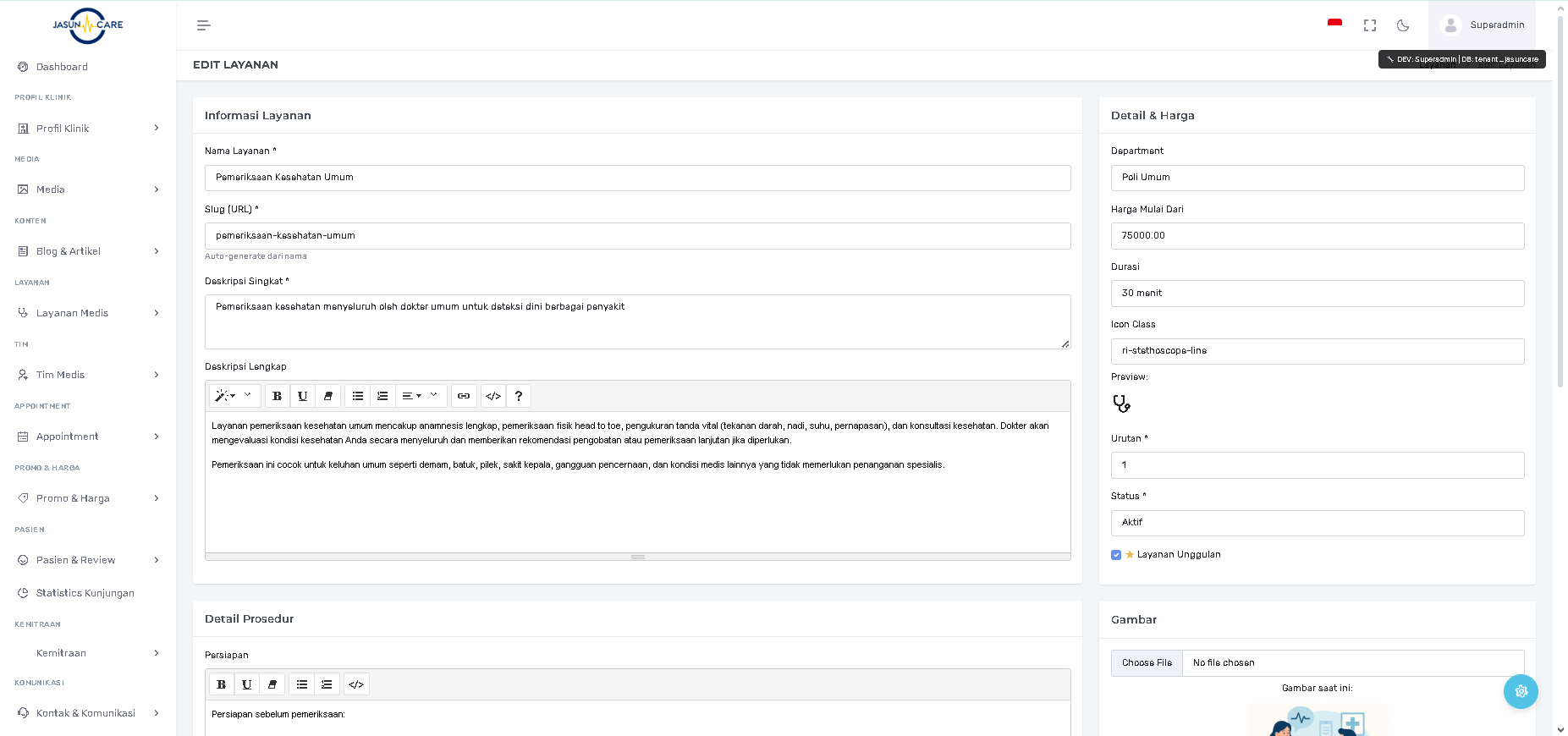 Lakukan perubahan pada informasi, harga, durasi, atau detail prosedur (Persiapan, Prosedur, Pasca Layanan).