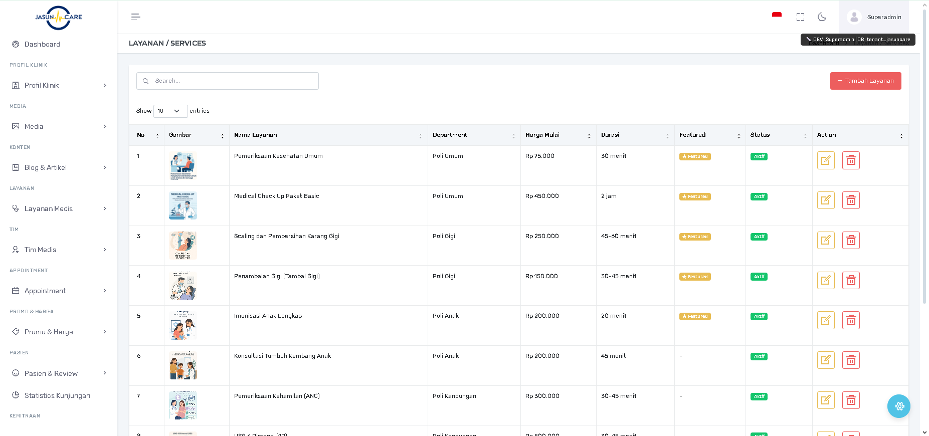 Fitur Layanan / Services adalah halaman inti untuk mengatur layanan spesifik yang ditawarkan klinik (misalnya: Pemeriksaan Kesehatan Umum) beserta detail biaya, durasi, dan prosedur yang terkait.