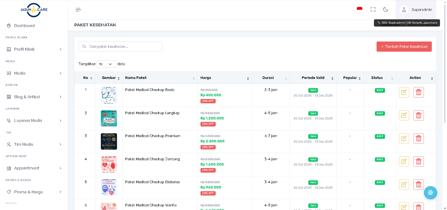 Klik tombol + Tambah Paket Kesehatan (berwarna merah) di pojok kanan atas tabel.
