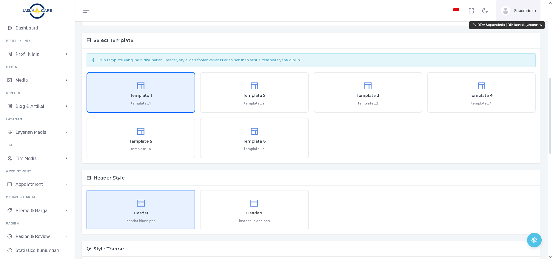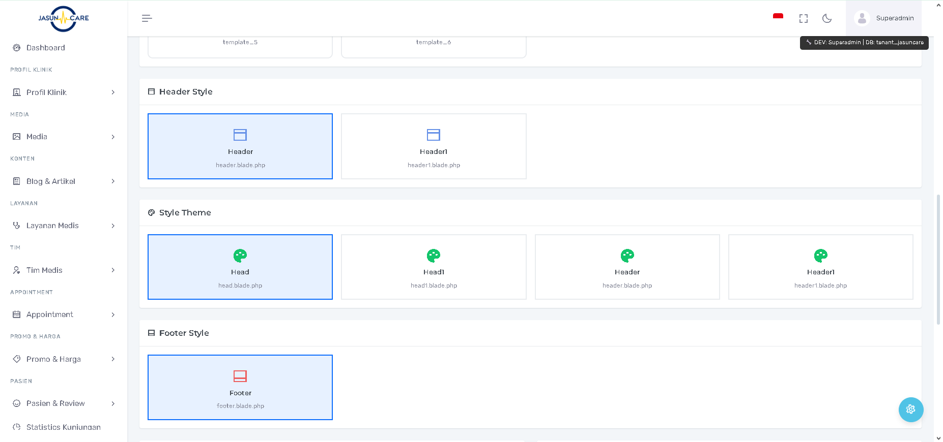 Perhatian Penting: Pemilihan template di sini harus sesuai dengan template yang Anda aktifkan di halaman Template Website sebelumnya, untuk memastikan Header, Style, dan Footer yang dipilih bekerja dengan benar. Header, style, dan font varian akan berubah sesuai template yang dipilih.