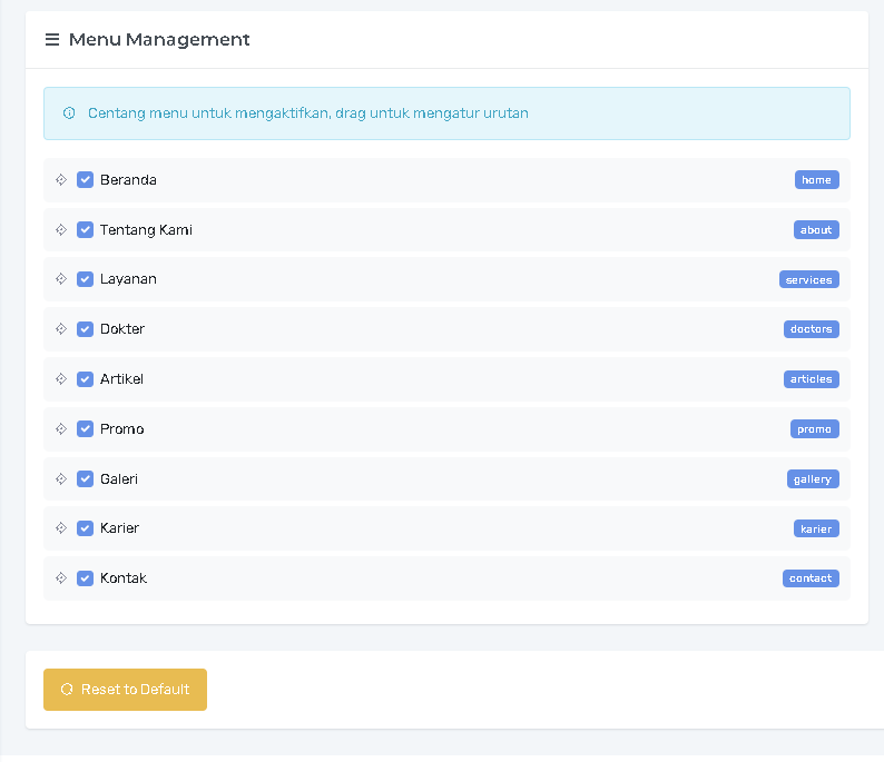Mengaktifkan Menu: Centang kotak di samping nama menu (Contoh: Beranda, Dokter, Layanan, Kontak) untuk mengaktifkan dan menampilkannya di frontend.