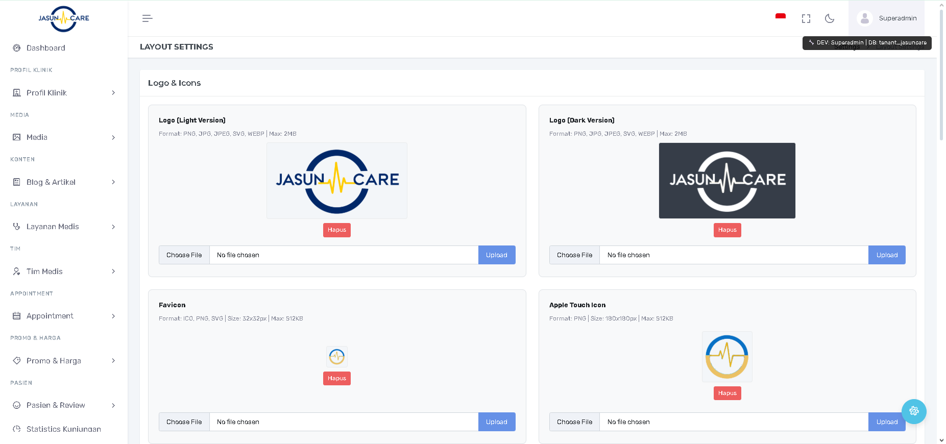 Bagian ini memungkinkan Anda mengelola identitas visual klinik di berbagai platform dan tampilan.