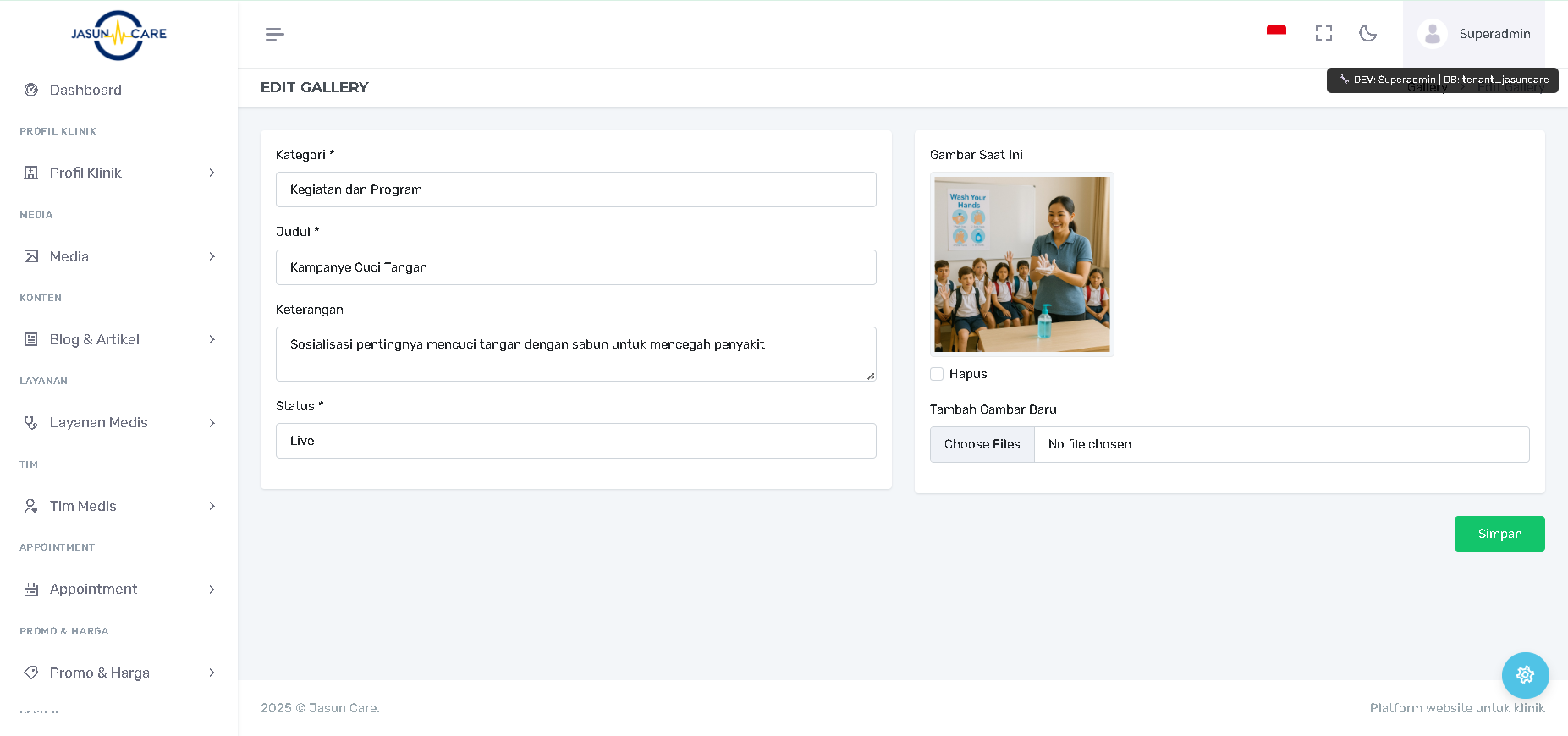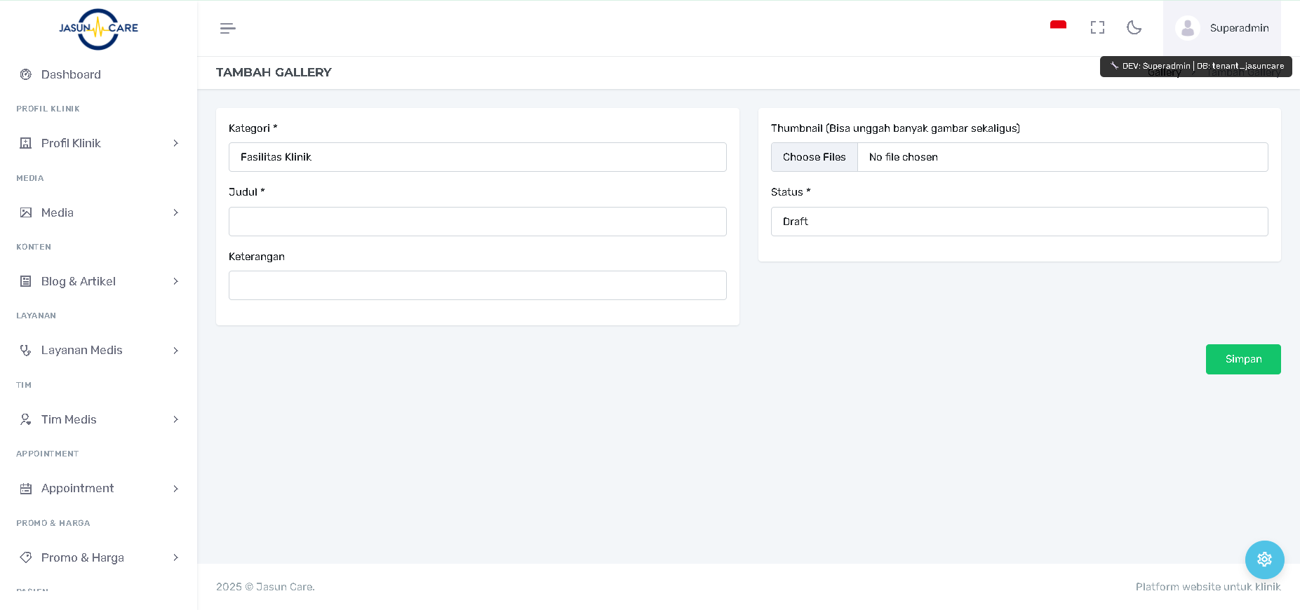 Kategori (Wajib): Pilih salah satu kategori yang sudah Anda buat dari dropdown (contoh: Fasilitas Klinik).