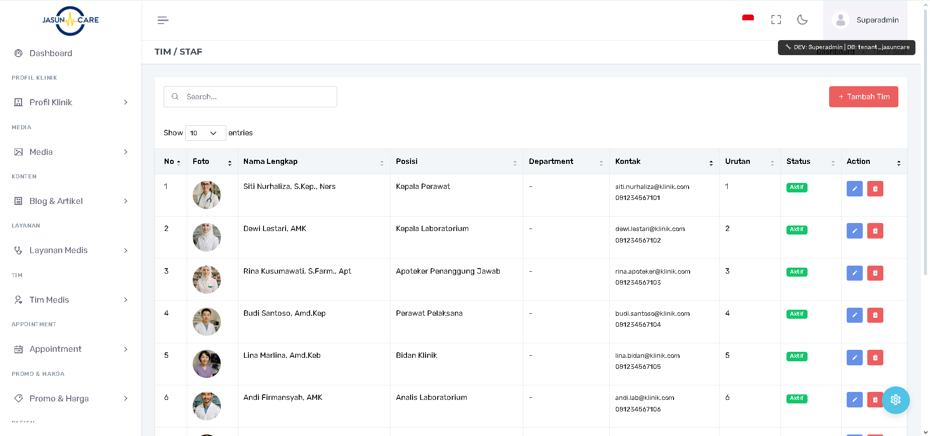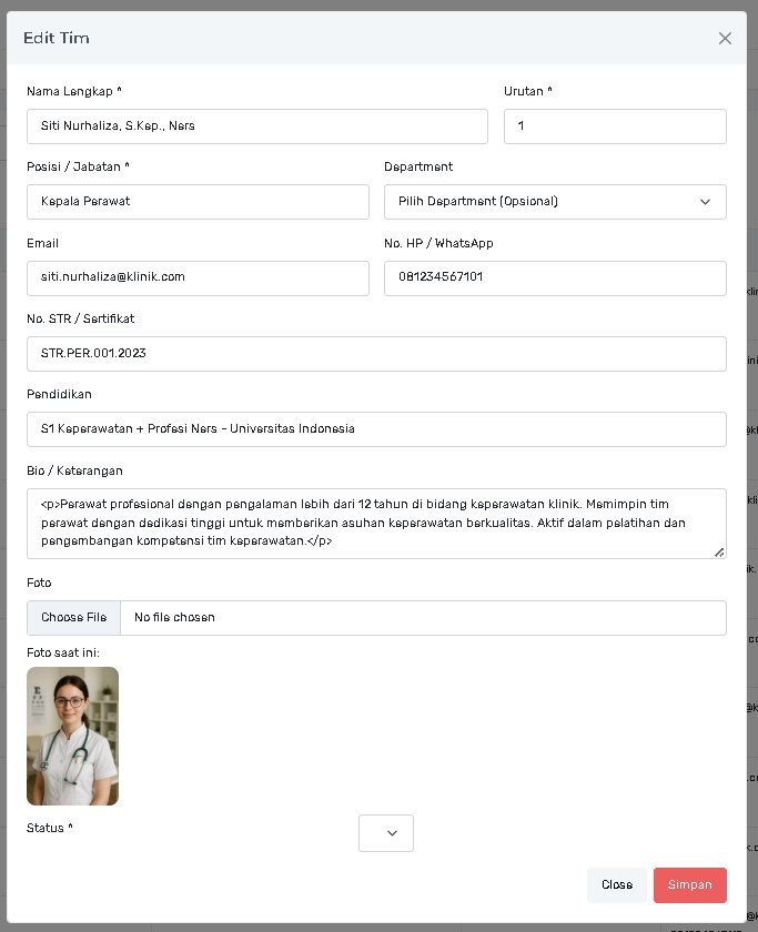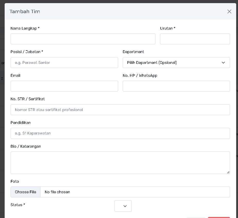 Fitur Tim / Staf digunakan untuk mendaftarkan dan mengelola informasi detail mengenai tim non-dokter (seperti perawat, apoteker, bidan, staf laboratorium, dan staf administrasi) yang bekerja di klinik.