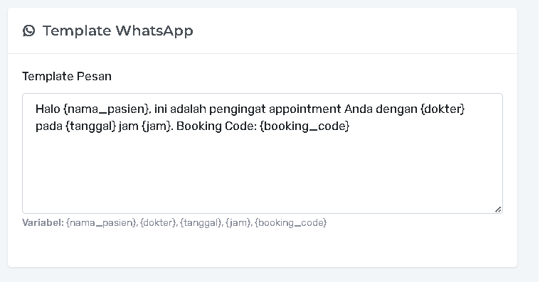 Halaman ini memungkinkan Superadmin/Admin klinik untuk mengonfigurasi dan mengaktifkan sistem pengingat Janji Temu otomatis kepada pasien melalui WhatsApp.